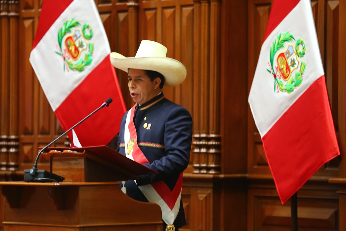 Peruvian President Pedro Castillo, in his trademark straw sombrero, delivering his inaugural address today.