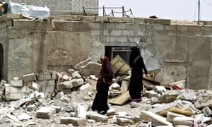 Yemeni women walk amid the rubble of houses destroyed by a Saudi-led air strike in Sanaa, 18 May 2015.