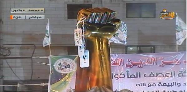 In an elaborate display at the late-night march in the Gaza Strip, a massive copper fist extending out of a tank holds up the three identity badges.