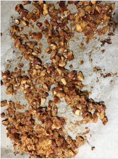 Salad made with Brussels sprouts, apples, and toasted almonds. Previously, the almonds had been cut finely and marinated in a lemon mixture. Then they were toasted in the oven for 20" and put over the salad.