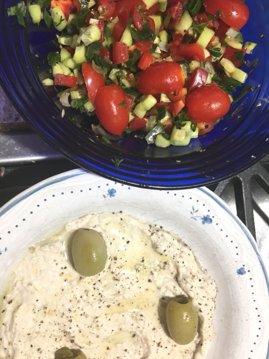 Middle Eastern Chopped Tomato Cucumber Salad on Whipped Tahini.