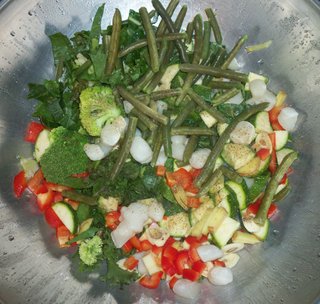 Tonight is panko-crusted sea bass, cucumber salad, and tossed green salad with chopped vegetables. I made the latter two. Green salad will have Caesar dressing.