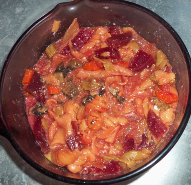 Beef, beets, noodles, garlic, carrots, mushrooms, yogurt.