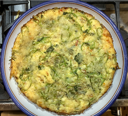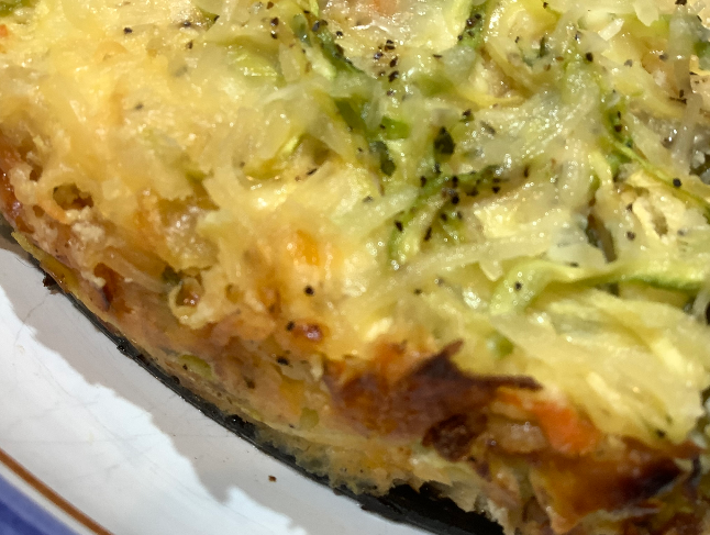 You can see the zoodles (zucchini noodles) in a swirly pattern on the top. They are mixed with cilantro and sprinkled with parmesan. Underneath are two layers of chopped vegetables mixed with ricotta and mozzarella.