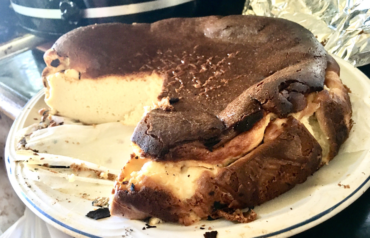 Even tho it's called a "burnt" Basque cheesecake, it's not intended to be literal. There are a few burnt flakes in the photos from where the batter spilled onto the parchment paper that was sticking up above the edge of the pan. (I accidentally spilled about a cup of the batter when moving the pan onto the baking sheet.