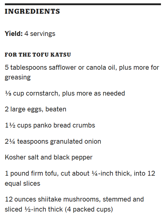 Make the katsu: Heat oven to 425 degrees. Grease 2 large rimmed baking sheets with the oil. Put cornstarch, eggs and bread crumbs in three separate shallow bowls, and add ¾ teaspoon of the granulated onion to each bowl. Season all with salt and pepper and mix well. Add 3 tablespoons oil to the bread crumbs and mix well.