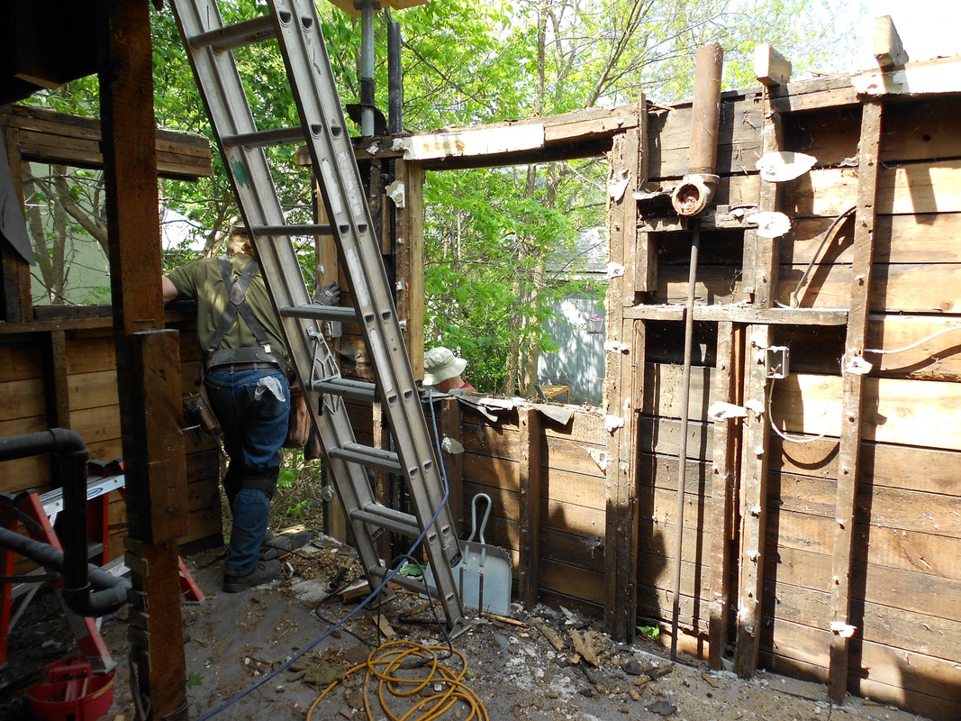 (129,726 posts)And the kitchen, such as it was, was added in the '30s (we found newspapers from 1933 in the walls). We were able to expand it by moving an interior wall and cantilevering it outward by a couple of feet, making it unnecessary to dig a new foundation; then we just added a little exterior deck along the back wall. So we did have to build new exterior walls (which meant duplicating the old siding), plus new windows. The cabinets go all the way to the ceiling so there won't be any dust and crud collecting there, and also all the way to the floor - too many cat toys would accumulate there otherwise. Here are photos during construction and after it was completed but before I messed it up: