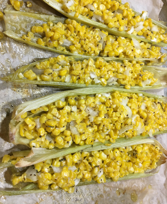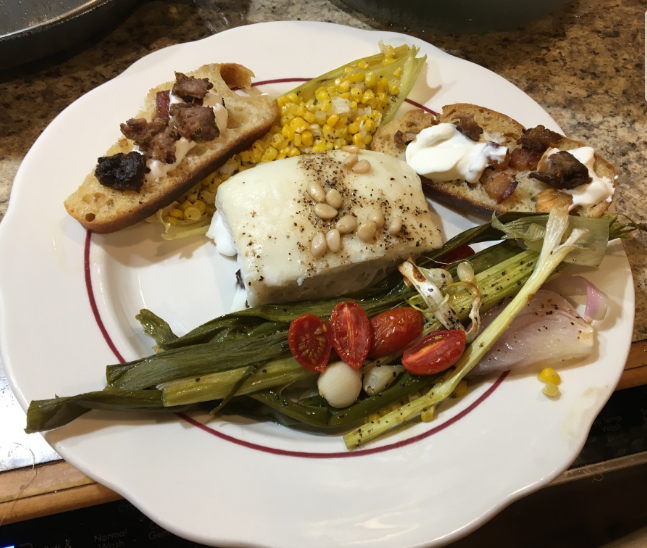 Halibut with toasted pignolis on top. Roasted corn, served in husk. Roasted leeks, red onion, tomatoes, garlic, etc.