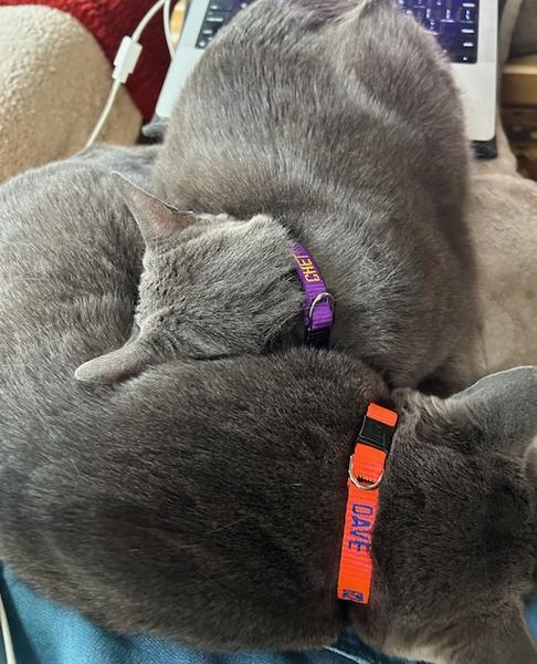 (130,962 posts)Dave is a little bigger than Chet and has a rounder face, so I can tell them apart up close. The collars help me identify them from a distance. Their personalities and voices are also pretty distinctive.