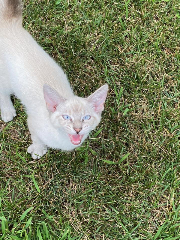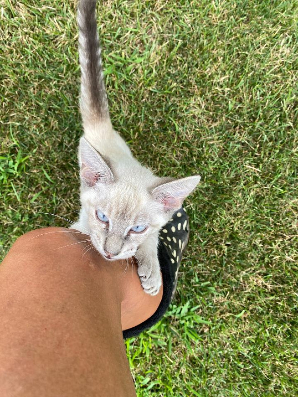 So Mrs. Glam brought her home yesterday evening. Beautiful Siamese. White, gray brown tail and ears, faint stripping on her legs, and the palest blue eyes. And huge paws! She gonna be a bigun!