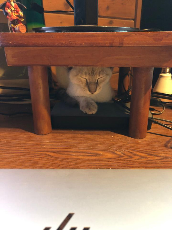 Sleeping behind my laptop, under a monitor