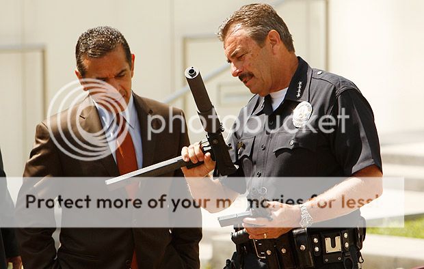 Los Angeles police Chief Charlie Beck and Mayor Antonio Villaraigosa showed off an array of handguns, rifles, shotguns, rifles and assault weapons collected at six locations and piled before them Monday at a news conference outside the Los Angeles Police Department Administration Building.