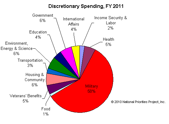 The US Military budget comes out of discretionary spending, the same pot as labor, environment, education, transportation, housing, etc. etc. etc. Here's the 2011 discretionary budget pie chart: