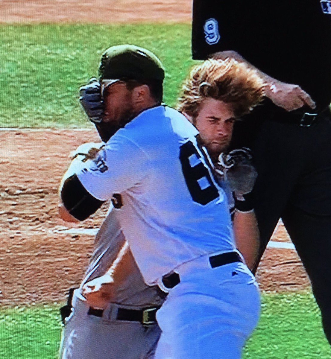 (10,893 posts)but it seems messed up to me how Harper was the one who started the fight, but Strickland got a harsher punishment. Also it was interesting that Posey was reluctant to do anything. Maybe he feared retaliation or suspension.