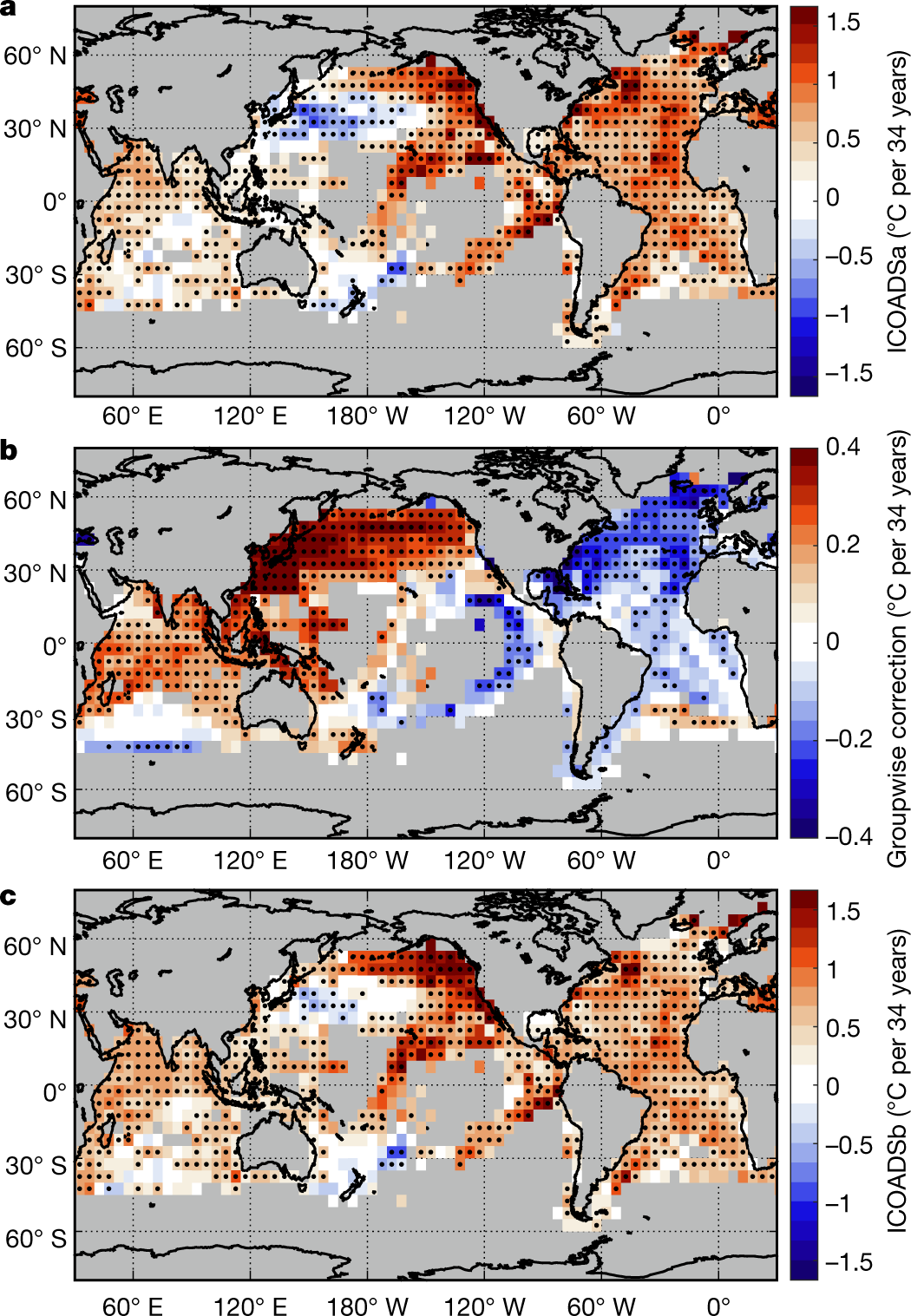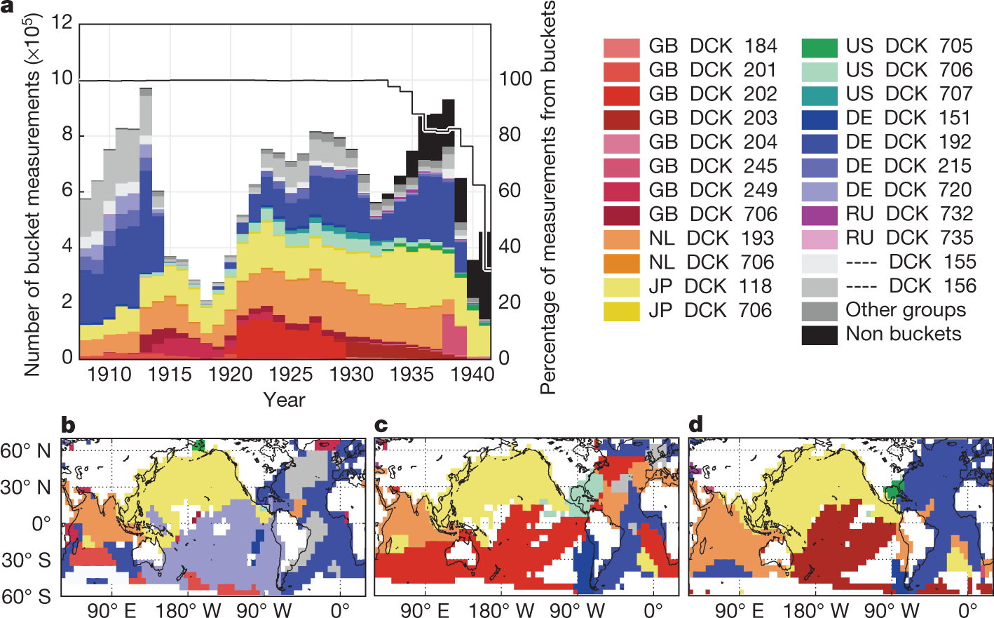 The four major SST products covering the early twentieth century each rely upon the International Comprehensive Ocean-Atmosphere Data Set (ICOADS)22, whose latest release is 3.0. It is estimated that 94% of observations between 1908 and 1941 were from buckets (Fig. 1). Bucket measurements of SST are biased by evaporative, sensible and solar heat fluxes that depend on a range of factors, including weather, ship deck height and bucket type7. For example, a canvas bucket left on deck for three minutes under typical wind and other weather conditions can give water temperatures that are approximately 0.5 °C cooler than a wooden bucket measured using the same protocol7,9...