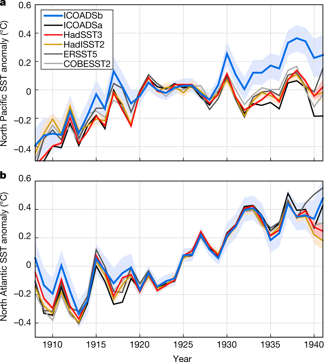 The paper I'll discuss in this post is this one: Correcting datasets leads to more homogeneous early-twentieth-century sea surface warming (Huyber et al Nature 571, 393397 (2019))