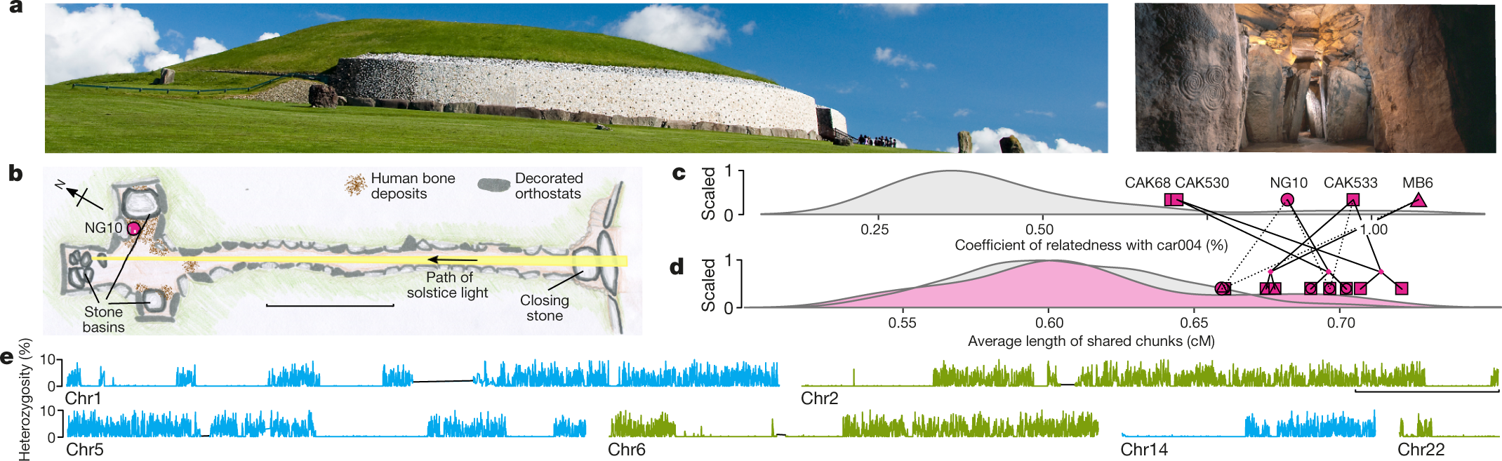 ...Overall, no increase in inbreeding is seen through time in Neolithic Ireland, which indicates that communities maintained sufficient size and communication to avoid matings between relatives of the fifth degree or closer (Fig. 1a). However, we report a single extreme outlier interred within the Newgrange passage tomba focal point of the monumental landscape of Brú na Bóinne, a United Nations Educational, Scientific and Cultural Organization world heritage site (Fig. 2a). Incorporating over 200,000 tonnes of earth and stone, this megalithic mound is one of the most spectacular of its kind known from Europe16...