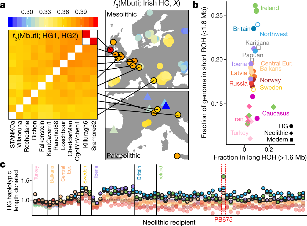 We sampled remains from all of the major Irish Neolithic funerary traditions: court tombs, portal tombs, passage tombs, Linkardstown-type burials and natural sites (Fig. 1a, c, Supplementary Information section 1). Within this dataset, the earliest Neolithic human remains from the islandinterred at Poulnabrone portal tomb14are of majority Early_Farmer ancestry (as defined by ADMIXTURE modelling15), and show no evidence of inbreeding (Fig. 1a, Extended Data Fig. 1), which implies that, from the very onset, agriculture was accompanied by large-scale maritime colonization...