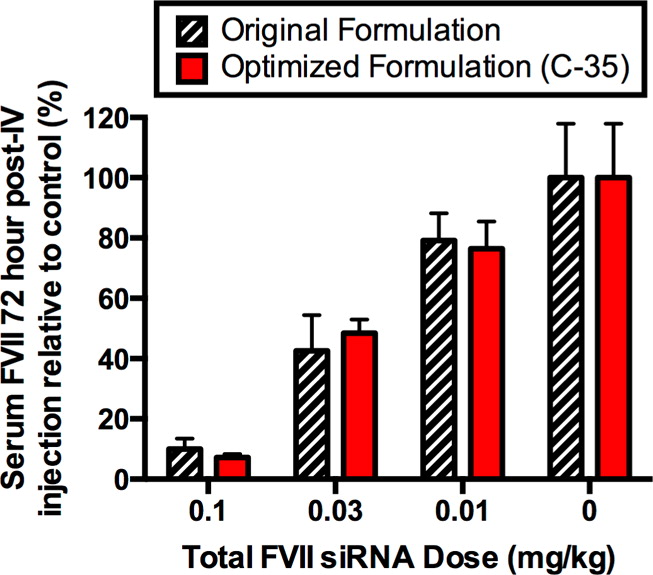 In addition to the ionizable material, three other excipients are also commonly used to formulate LNPs: (1) a phospholipid, which provides structure to the LNP bilayer and also may aid in endosomal escape; (2, 13) (2) cholesterol, which enhances LNP stability and promotes membrane fusion; (14, 15) and (3) lipid-anchored polyethylene glycol (PEG), which reduces LNP aggregation and shields the LNP from nonspecific endocytosis by immune cells.(16) The particular composition of the LNP can also have profound effects on the potency of the formulation in vivo. Several previous efforts to study the effect of formulation parameters on siRNA-LNP potency utilized the one-variable-at-a-time method,(17, 18) in which formulation parameters were individually varied to maximize LNP potency; this approach, however, does not allow for examination of potentially important second-order interactions between parameters. Inspired by statistical methodologies commonly used in the engineering and combinatorial chemistry literature,(19, 20) we chose to utilize Design of Experiment (DOE) to better optimize LNP formulations for nucleic acid delivery. Using DOE, the number of individual experiments required to establish statistically significant trends in a large multidimensional design space are considerably reduced, which is particularly relevant for the economical screening of LNP formulations: in vitro screens are often poor predictors of in vivo efficacy with siRNA-LNPs,(21) and it would be both cost- and material-prohibitive to test large libraries of LNP formulations in vivo.
