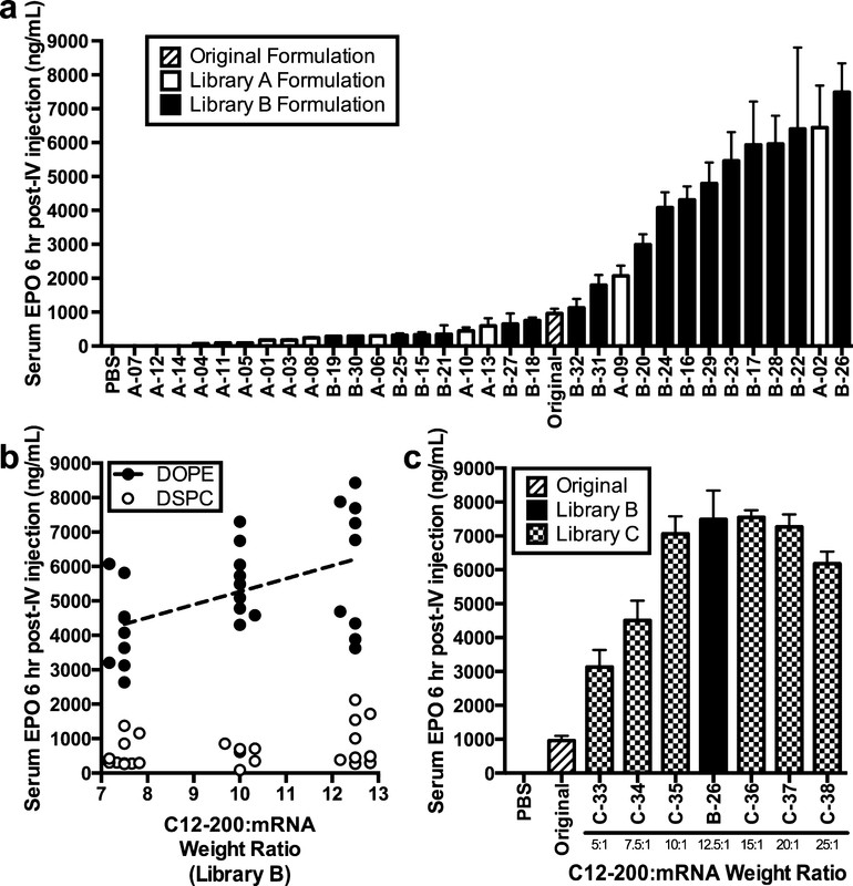 To demonstrate the application of DOE to LNP formulation optimization in vivo, we formulated LNPs with a different type of nucleic acid than siRNA. Recently, messenger mRNA (mRNA) has been investigated for therapeutic protein production in vivo, including applications in cancer immunotherapy, infectious disease vaccines, and protein replacement therapy.(22, 23) Unlike plasmid DNA, mRNA need only access the cytoplasm rather than the nucleus to enable protein translation and has no risk of inducing mutation through integration into the genome.(24) Because there are inherent chemical and structural differences between mRNA and siRNA in terms of length, stability, and charge density of the nucleic acid,(25) we hypothesized that LNP delivery formulations for mRNA may require significant variation from those developed for siRNA delivery...