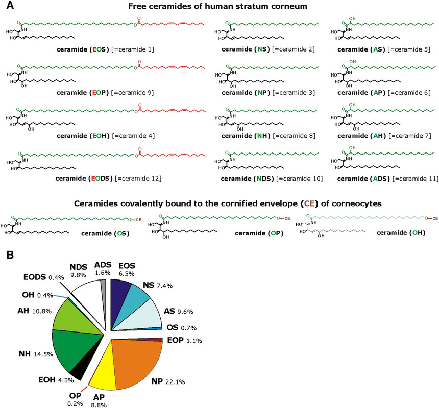 To give a feel for the complexity of lipids beyond the straight chain fatty acids, here is a chart showing types of a class of lipids that are found prominently in skin, the ceramides: