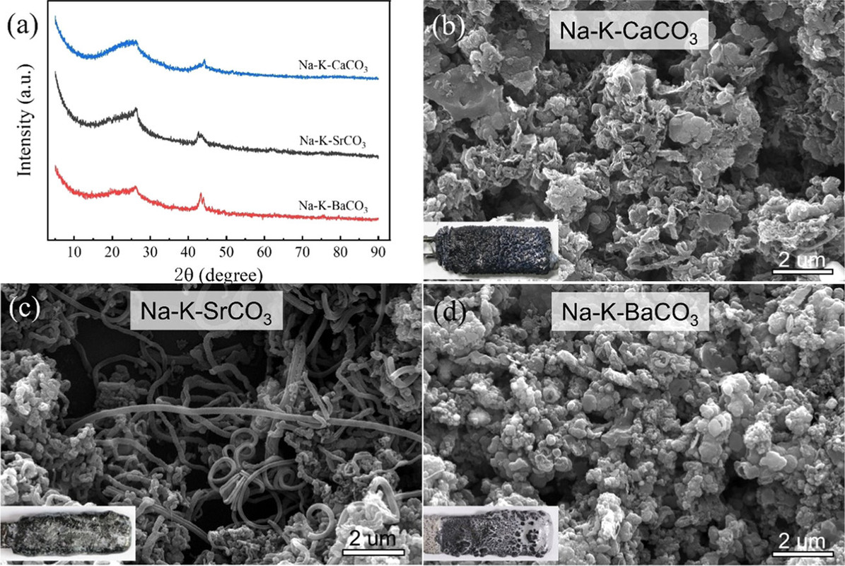 Thermodynamically, alkaline-earth metal carbonates (MCO3, M = Mg, Ca, Sr, and Ba) can be electrochemically converted to carbon at the potential prior to the deposition of the alkaline-earth metal (Figure 1c). Therefore, the deposition of carbon is thermodynamically easier than that of metal. Moreover, the thermodynamic favorability of generating carbon is different depending on the different alkaline-earth metal cations. For example, the thermodynamic deposition potential sequence follows CaCO3 < SrCO3 < BaCO3. In other words, CaCO3 can be reduced to carbon at the potential more positive than that of SrCO3 and BaCO3. Note that the potentials of carbon generation in Na2CO3 and K2CO3 are more negative than that of the deposition of the corresponding alkali metals. Thus, Na2CO3 and K2CO3 are usually employed as the supporting electrolyte.(39,44) Therefore, alkaline-earth carbonates are the solute to be reduced for the carbon generation in MCO3Na2CO3K2CO3 (M = Mg, Ca, Sr, and Ba).