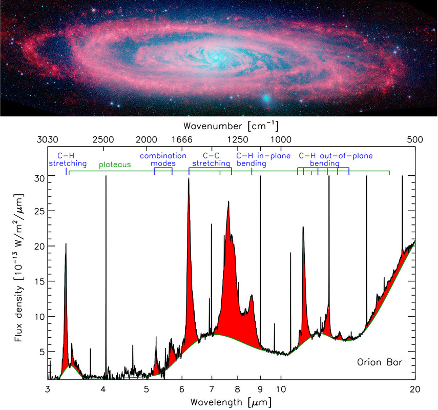 Figure 1. Top: Spitzer-IRAC image of the Andromeda galaxy with the 3.6 and 4.5 μm (2778 and 2222 cm1) emission (respectively blue and green) representing the stellar population and the 8.0 μm (1250 cm1) emission (red) showcasing the ubiquitous PAH emission. Credit: NASA/JPL-Caltech/P. Barmby (Harvard-Smithsonian CfA). Bottom: The IR spectrum of the star-forming region, the Orion Bar, observed by the Infrared Space Observatory (ISO). The AIBs are shown in red, superimposed on top of broad plateaus. The corresponding vibrational modes are labeled at the top. Adapted with permission from ref (25). Copyright 2004 Astronomical Society of the Pacific.