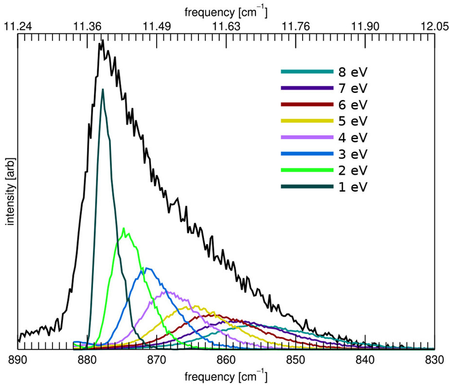 Figure 6. Calculated emission spectrum of the CH out-of-plane bending mode of anthracene (C14H10) as a function of the excitation energy (colored traces). The black trace is the spectrum calculated following the full energy cascade.