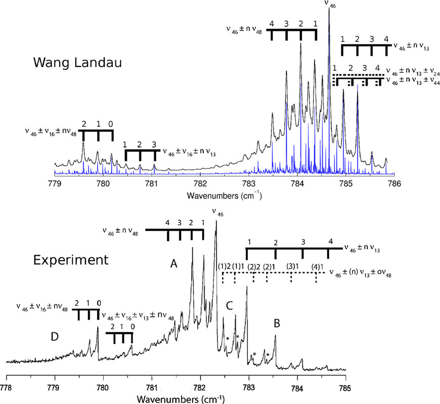 Figure 5. Measured absorption spectrum of naphthalene (at 300 K; bottom(104)) compared to the calculated spectrum in the anharmonic approximation (blue sticks) convolved with a 0.02 cm1 Gaussian (at 300 K; top(4)). Anharmonic interactions of the fundamental (ν46) with specific modes result in satellite bands shifted to lower or higher frequency. Reproduced with permission from refs (4) and (104). Copyright 2018 and 2009 AIP Publishing