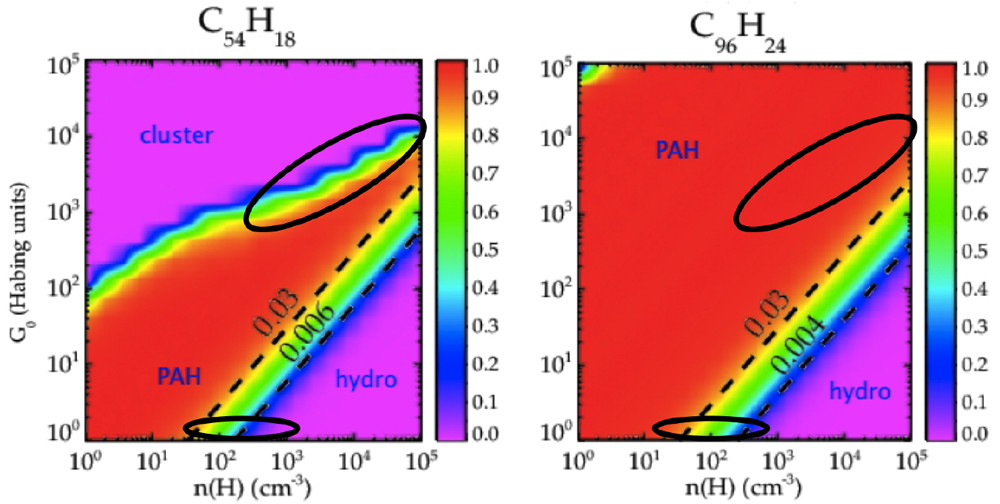 Figure 7. Characteristics of circumcoronene (C54H18; left) and circumcircumcoronene C96H24; right) as a function of the strength of the FUV field, G0, and the atomic H density, nH. For high FUV fields, PAHs will be quickly completely dehydrogenated (labeled clusters), while, for high atomic H densities, PAHs will be superhydrogenated (labeled hydro). The two ovals in each panel indicate typical conditions in PDRs (top oval) and in diffuse interstellar clouds (bottom oval). Dashed black lines indicate constant G0/nH ratios.(1) Reproduced with permission from ref (1). Copyright 2016 EDP Sciences.