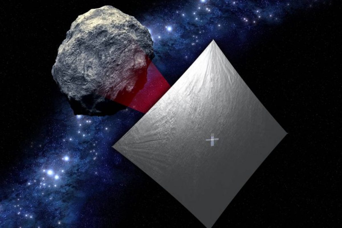 Illustration of NASAs NEA Scout with the solar sail deployed as it flies by its asteroid destination. (Credit: NASA)