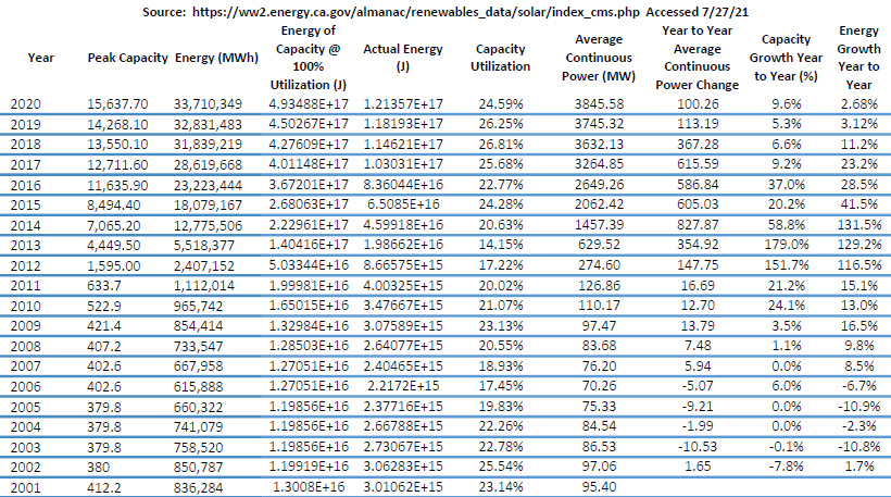 I detailed the capacity utilization of solar energy, as reported by the California Energy Commission - capacity utilization is the actual energy produced as compared to the theoretical peak capacity if a generation system (any generation system) functioned at full peak capacity for a given period of time as a percentage - in another post on this site: The Growth of Solar Capacity In California, Capacity Utilization, and Solar Energy Production.