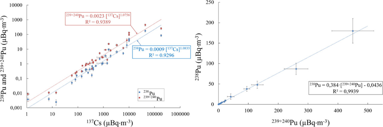 In the graphic immediately above, designed to show the ratio between plutonium and cesium, we see that most measurements of cesium-137 data points were below 10,000 μBq/m^3. This means that one must wait, on average, 100 seconds to observe a single decay of a single radioactive decay of a single atom of radiocesium in a cubic meter at 10,000, ten seconds at 100,000 μBq/m^3. . An adult human breath is about 0.002 to 0.003 cubic meters.
