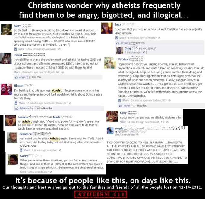 (9,356 posts)Upthread I predicted atheists would get blamed for the atrocity in CT. Though I admit, predicting this sort of behavior from Xians is on the same level as prophesying that rain will be wet.