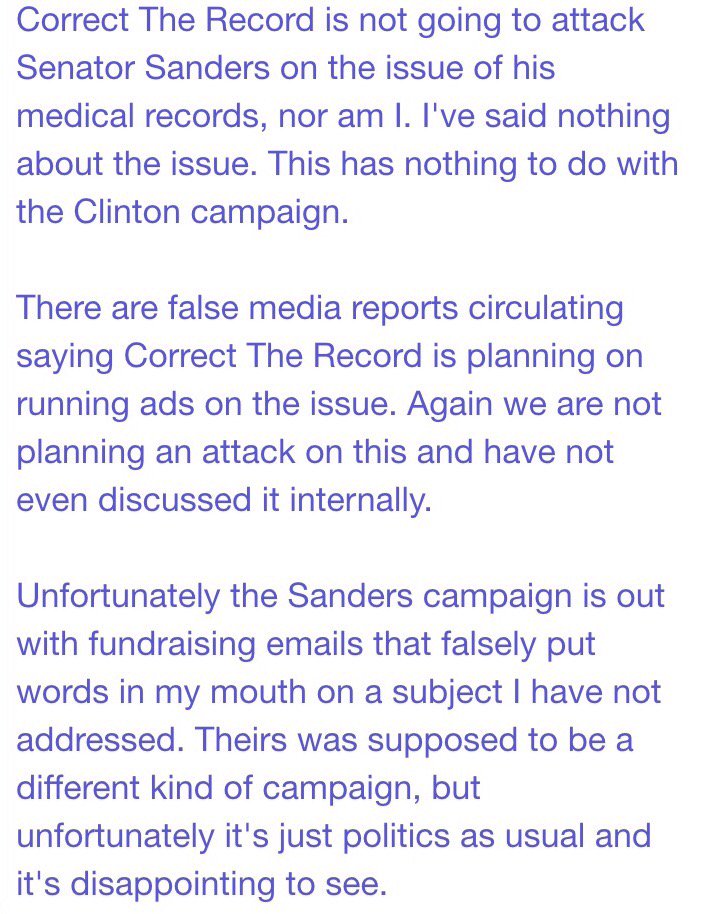 Statement from @davidbrockdc saying reports he wants to attack Sanders abt medical records are "false" (v @jonkarl)