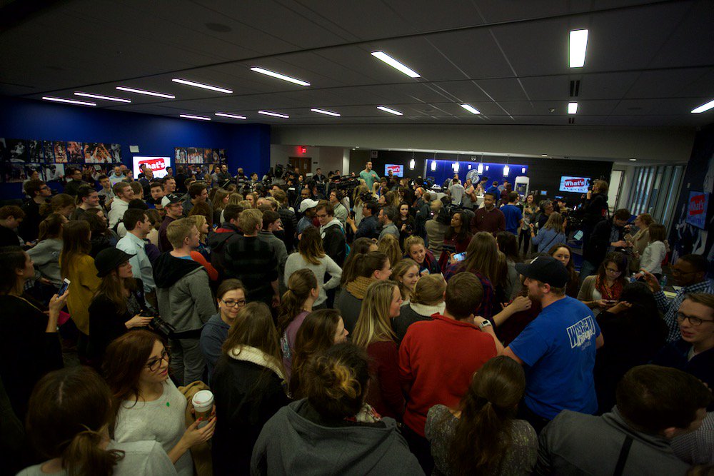 A glimpse of the student-organized Democratic #iacaucus simulation tonight. ~200 participants.