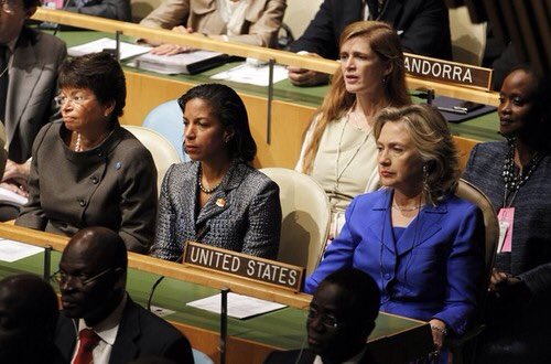 Too bad these particular women - Jarrett, Rice, Clinton, Power behind them - are in the business of creating wars. Always with humanitarian justifications of course. We came, we saw, he died, ha ha ha. Also, Power is the one who called Clinton a "monster." But anyway.