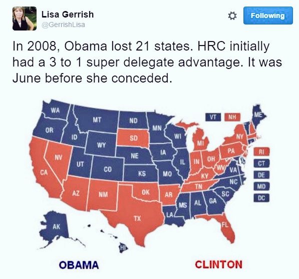 Hillary has won 5x states in 2016 that Obama won in 2008 (Iowa, South Carolina, Alabama, Georgia, and Virginia.)