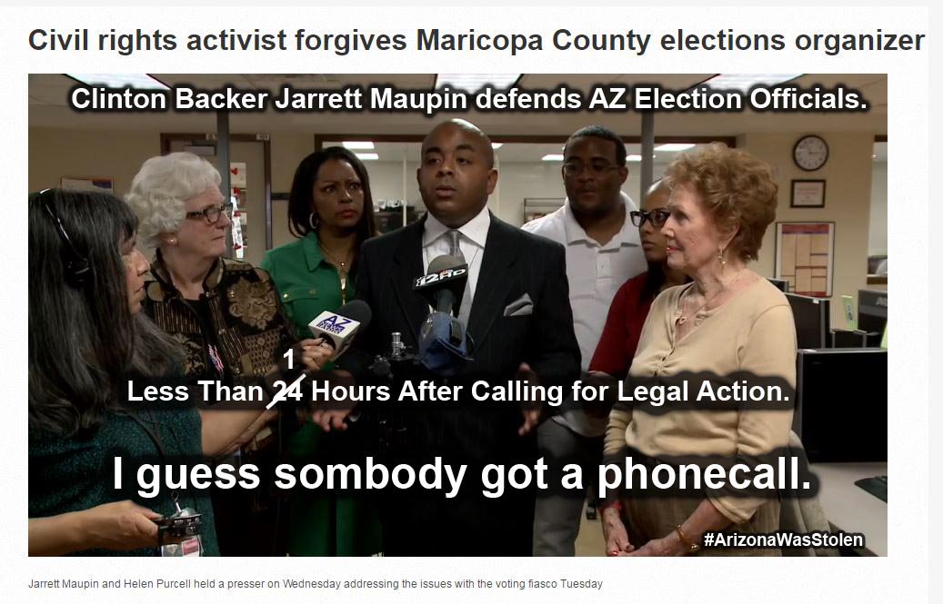 Clinton supporter Jarrett Maupin absolves Maricopa County elections organizers of any wrong doing, and declares mission accomplished on Civil Rights and Voting Right in Arizona after calling for legal action less than 24 hours earlier.