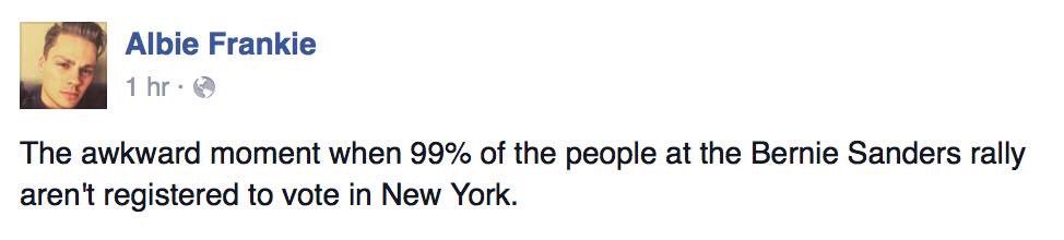Sure, it's hyperbole, maybe serious, maybe tongue-in-cheek... but it rings true. We've seen this before in states like Texas and Florida where huge crowds at Sanders rallies fail to translate into huge support at the ballot box, especially in closed-primaries like New York's.