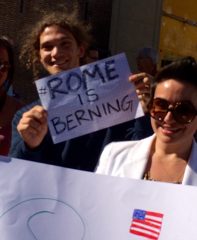 "As he arrived in his motorcade, he was greeted by roughly two dozen expat Americans holding Feel the Bern and Bernie 2016 signs, outside Perugino's Gate."