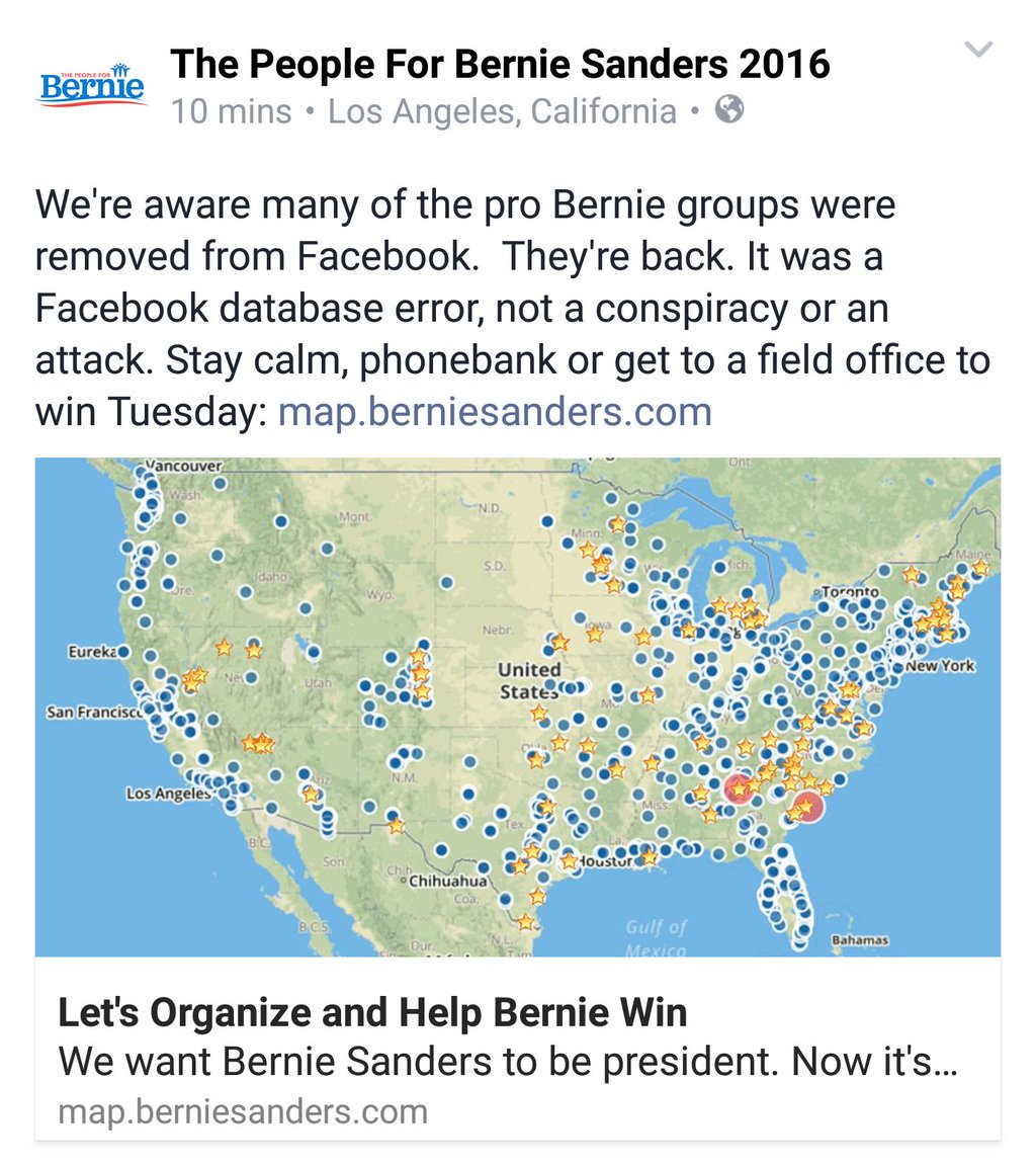 (6,498 posts)An issue hits that impacts a wide range of diverse subjects, groups, and pages, but since it ALSO impacted some Bernie groups, it's a conspiracy.