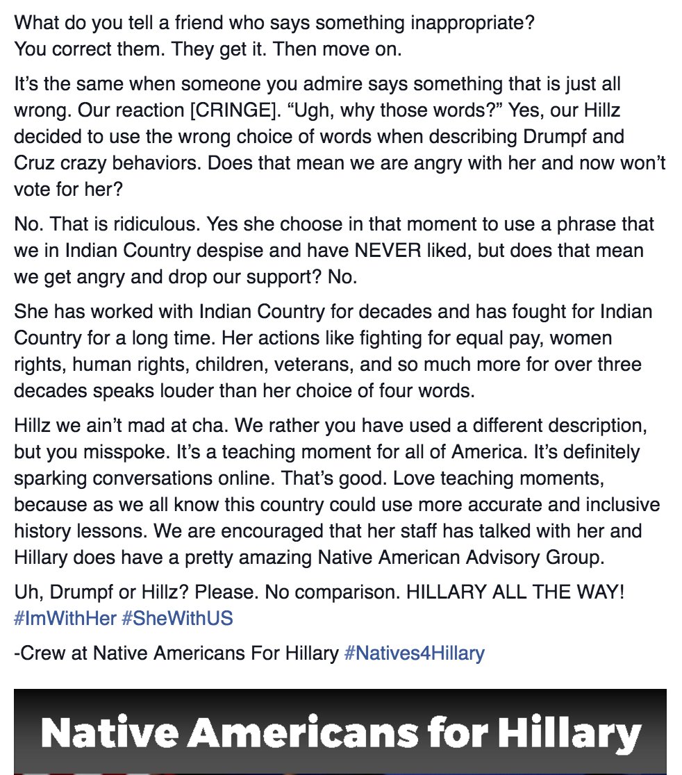 What she said was careless, but she was not intentionally demeaning Native Americans, and I think we all know that.