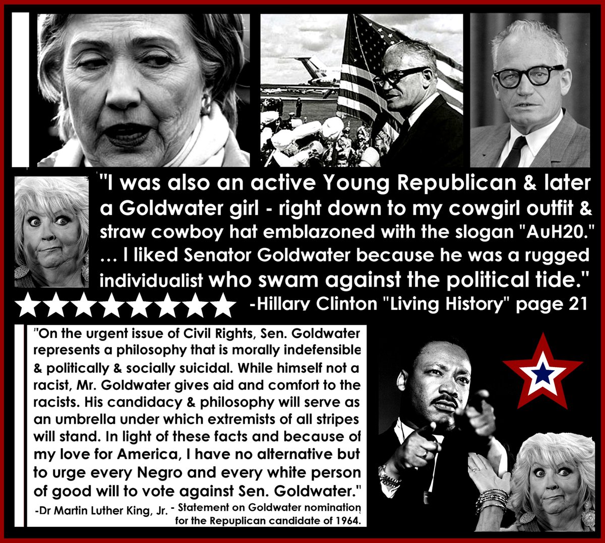 I knew as a teenager that Goldwater was a lying pos and he was hateful. And I have always been a Democrat. H, on the other hand, did not and is hardly a real Democrat but she is using the party and her husband's name to make herself rich and powerful.