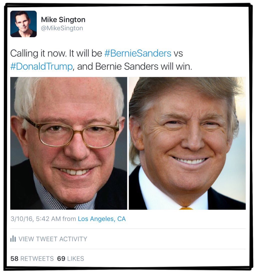 Related: About this forumMike Sington: Calling it now...It will be Bernie vs Trump and Bernie will win!!