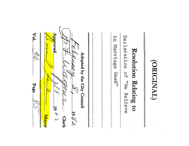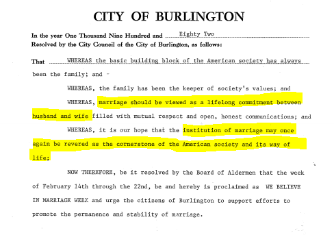 (80,708 posts)If the Burlington Proclamation was made "to honor the institution of marriage", it might have been put out in response to a rise in the divorce rate, or something like that, which would make sense for 1982.