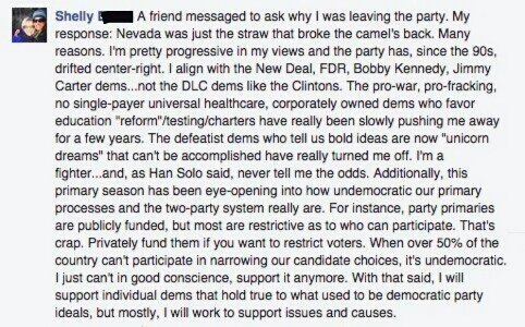 (50,566 posts)Now I'm thinking along the lines of this woman Shelly. I can no longer in good conscience support and enable Clintonian DLC Third Way corporatist sleaze.