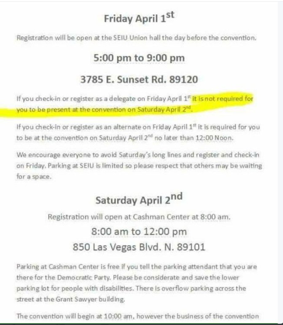 Oh look everything in that email follows the state parties rules on when registration is supposed to happen. The 3 hour mandatory registration time on Friday was met. The 2 hours before convention convened on Saturday was met. The keeping registration open until noon on Saturday was met. The dates were correct. Once again, the email was truthful. No one was lied to. Bernie supporters didn't cheat. Large numbers of Hillary supporters just didn't bother to register for the second round. That's why they lost it.
