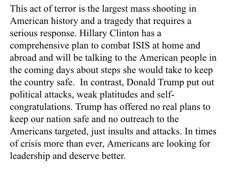 HRC campaign hits Trump for responding to Orlando w/ 'political attacks, weak platitudes and self-congratulations'