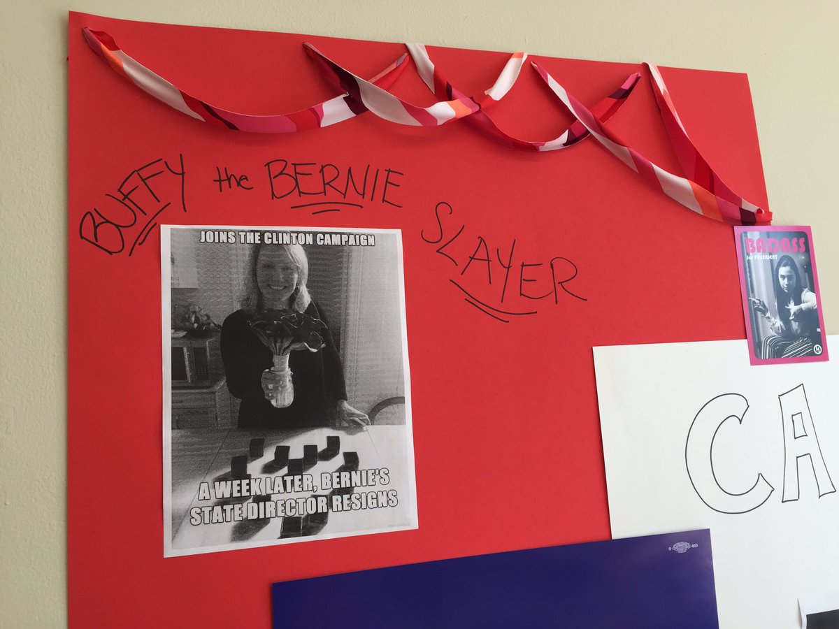 I hear her before I see her. Her laughter, really. It rolls through the hallway, trips through the eighth-floor campaign office that, even after three weeks in the building, still holds some prior tenants nameplate on its door. An aide leads me to an unglamorous waiting area, all ibuprofen bottles and strewn gum packets. I look up and see a photo plastered on the wall of a smiling blonde, and a caption: Buffy the Bernie Slayer.